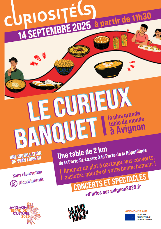 Le 14 septembre 2025, à Avignon, une table de 2km sera installée autour des remparts. Nous attendons environ 7500 personnes. Plus d’informations ici.