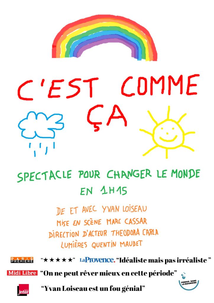 C’est comme ça est un spectacle seul en scène qui parle du désir de changer le monde, pour le rendre plus beau, plus juste. C’est comme ça, c’est la fatalité qu’on ne veut plus entendre : arrêter de réagir pour agir, rugir, être dans l’action. A travers des expériences interactives avec le public et mêlant son histoire intime, Yvan Loiseau essaye de questionner le commun, notre humanité. Il se demande pourquoi c’est aussi difficile de vivre ensemble, et comment tout pourrait être plus simple. Qu’avons nous à changer pour que le monde change ? Quelles sont les solutions réalistes pour que tout aille mieux.