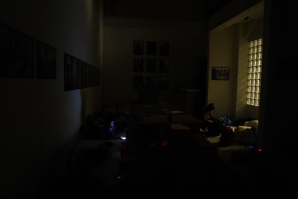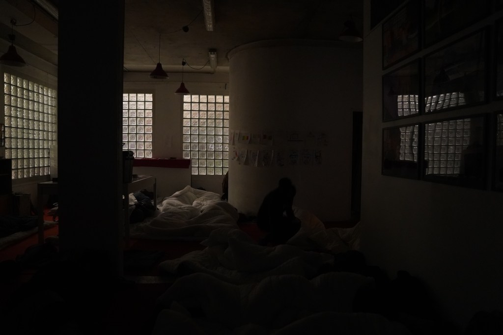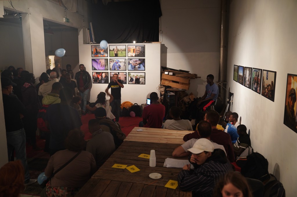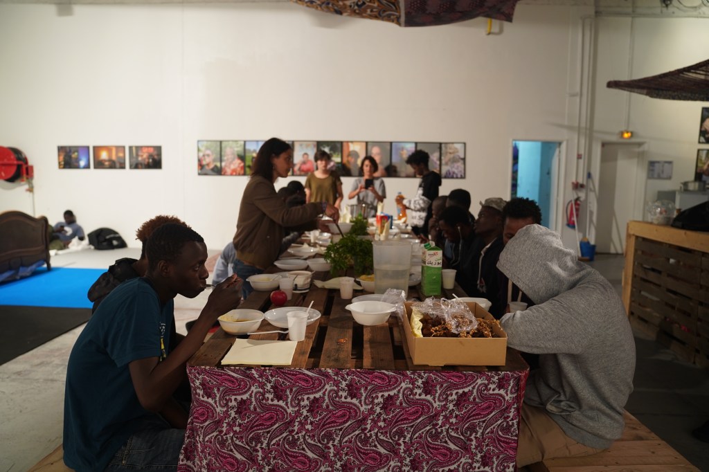 Salade de racines scénographie un lieu de vie, c’est une transformation d’une galerie d’art en lieu de rencontre par la cuisine. Les visiteurs peuvent rester y manger et y dormir. C’est une tentative de réponse artistique aux problématiques d’accueil. Tous les soirs on mange ensemble gratuitement, après avoir cuisiner. On se rencontre autour de la table. Depuis le début de son itinérance, plus de 2500 personnes ont pu la visiter, dont 500 qui sont restées dormir.