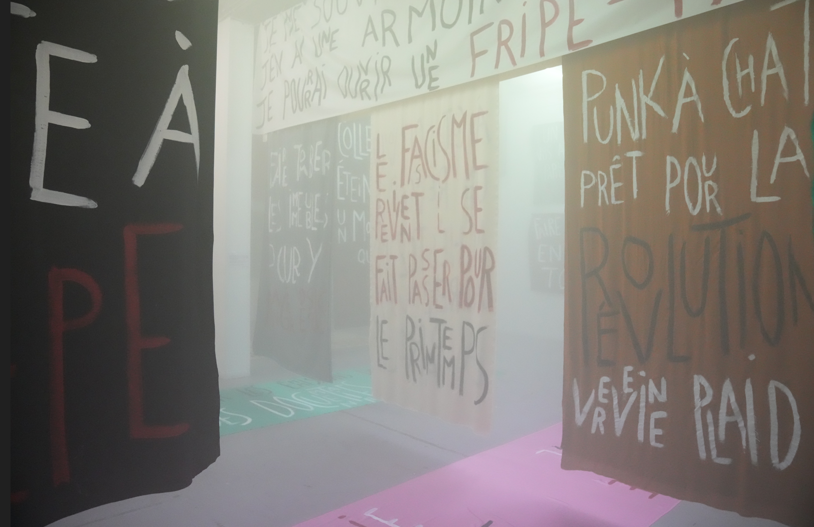 Cette exposition tente l’alliance poésie militantisme. Face à la répression qui mutile nos corps depuis des années, face à une justice qui protège les criminels, face aux génocides autorisés, face à la planète qu’on laisse polluer comme si nous n’en dépendions pas, face aux femmes et enfants qui meurent dans le silence, face à toute la violence qu’on peut vivre en allant marcher un 1er mai. Ces slogans sont décalés, absurdes, poétiques, politiques, en souvenir des gazs lacrimos, des coups de matraques, des tirs tendus de LBD qui me frôlent le visage. En souvenir aussi de toutes les amitiés, les rencontres, les fêtes, les bouffes que ces moments collectifs permettent. J’ai voulu une exposition où je pourrai crier sans crainte dans un moment où nos libertés de manifester sont tous les jours menacées.